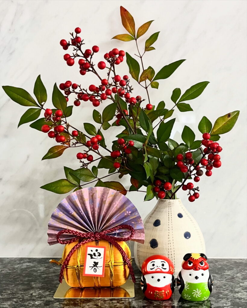 南天の赤い実とお正月飾りで、ささやかな迎春コーナーをつくりました。